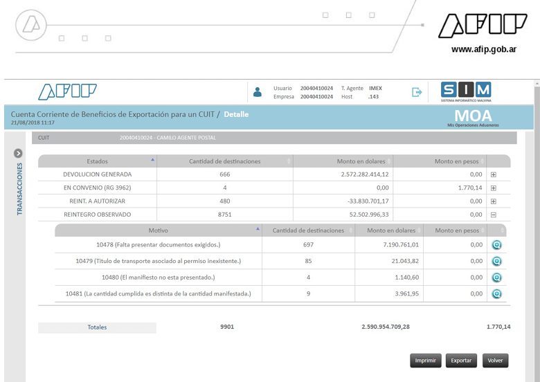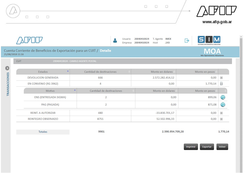 En la pantalla inicial, el sistema mostrará, agrupados por Estado del Reintegro, un resumen de los beneficios de exportación.