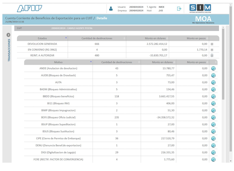 Seleccionando el icono de lupa celeste, se podrá acceder al detalle de las devoluciones:
